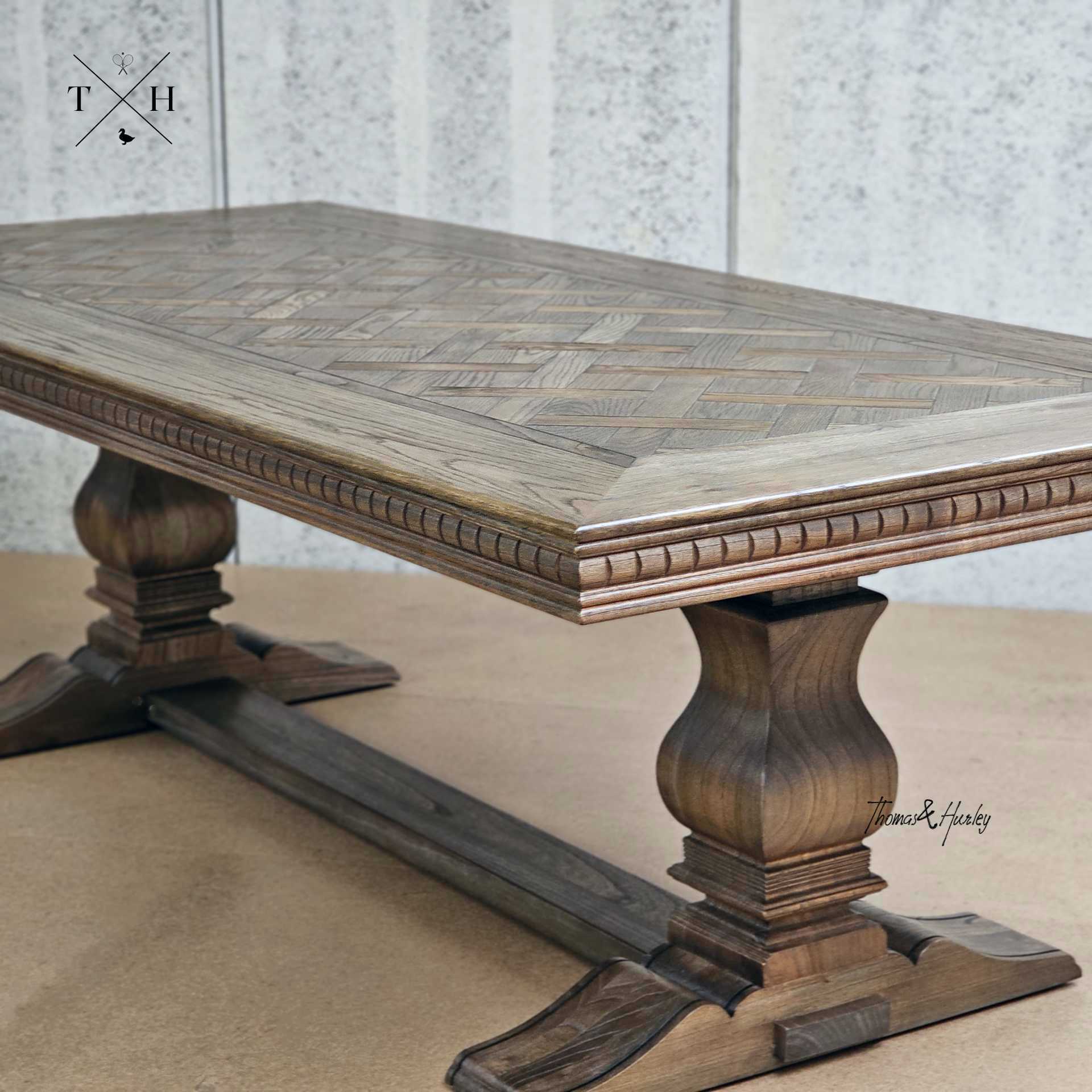 Bedford Burnished Oak Parquetry Dining Table - 245cm Introducing the Bedford Burnished Oak Parquetry Dining Table—a stunning example of exceptional craftsman… Log in for pricing